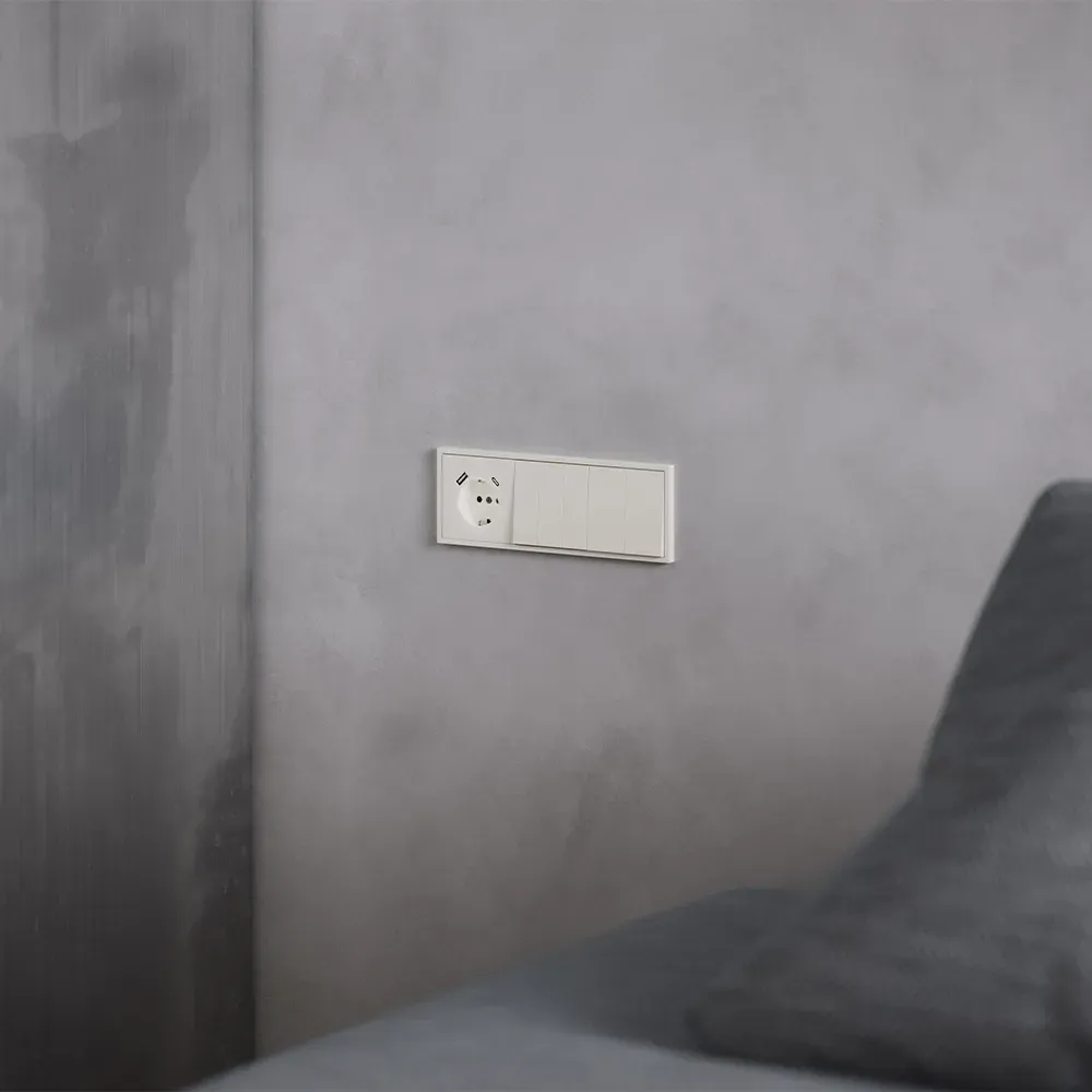 Двухклавишный проходной переключатель VOLTUM S70 в цвете «хлопок» — это продвинутое решение для независимого управления двумя группами освещения из двух и более точек. Идеально подходит для просторных гостиных, спален с отдельной зоной отдыха, офисов и многоуровневых помещений, где требуется гибкость и удобство управления светом — например, у входа и у изголовья кровати.
